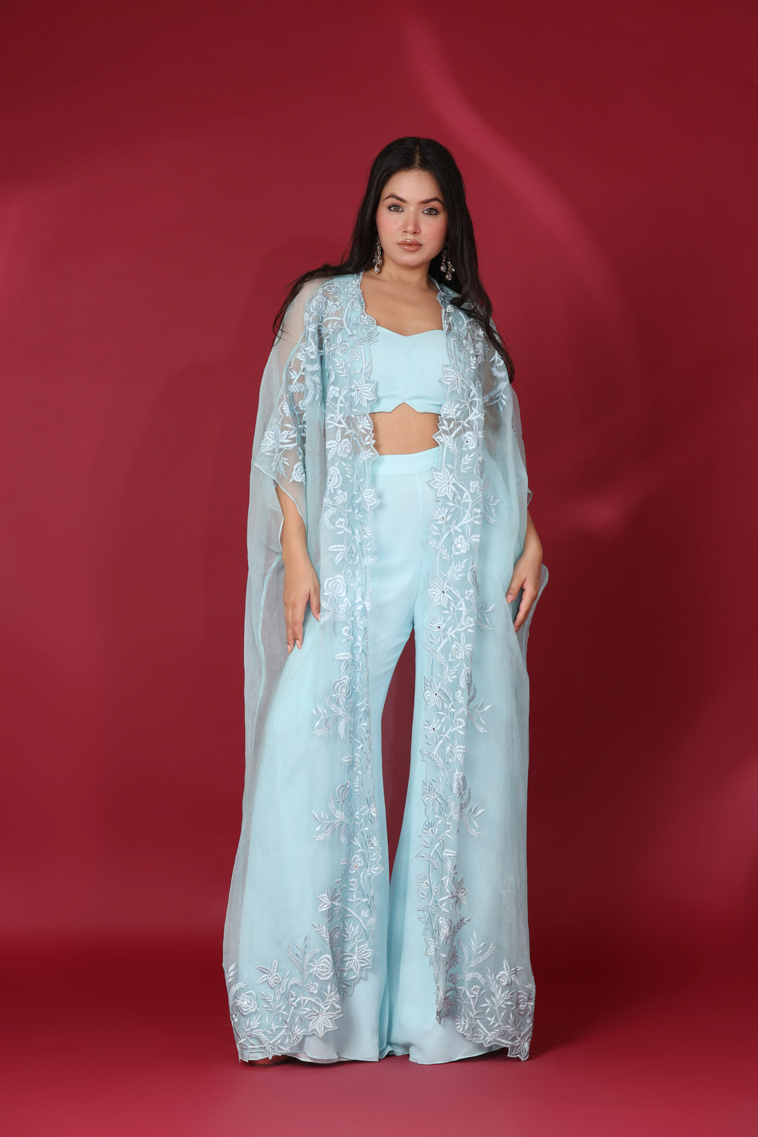 "This stunning aqua-colored cape set features: - A beautiful cape with intricate floral embroidery...