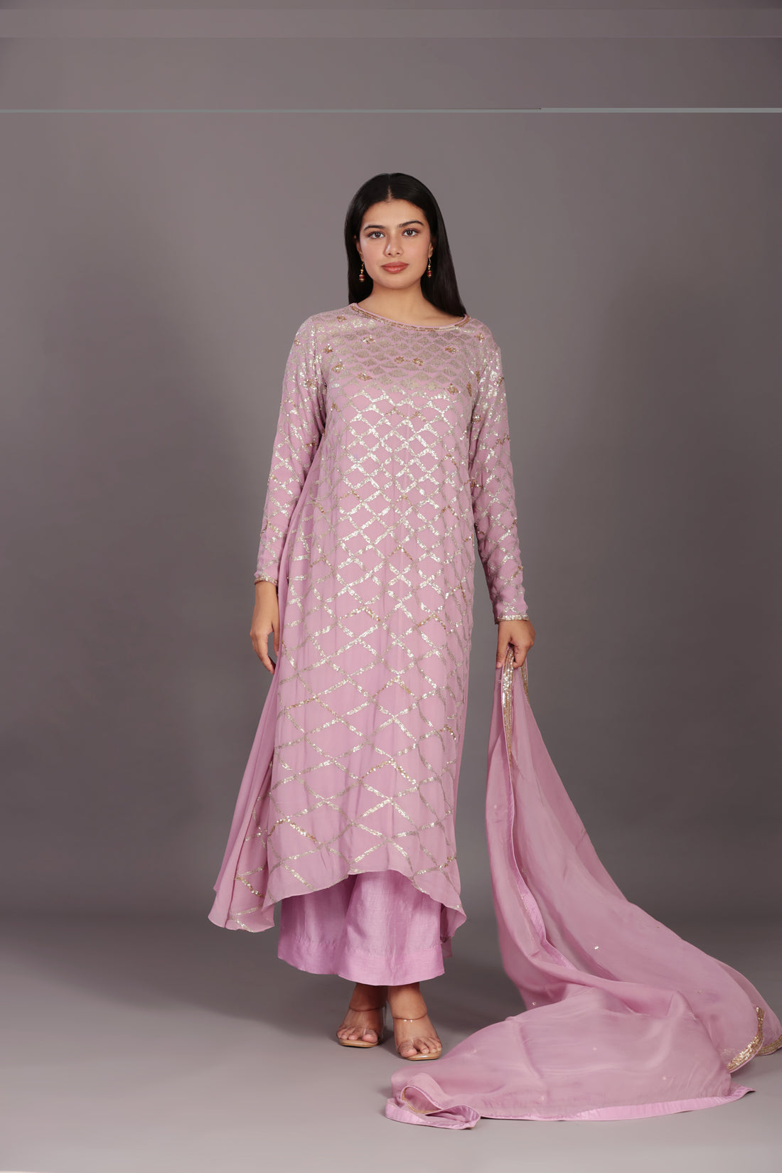 Mauve Orchid Long Kurta Set fabric pure georgette work hand embroidery sequence in whole kurta...