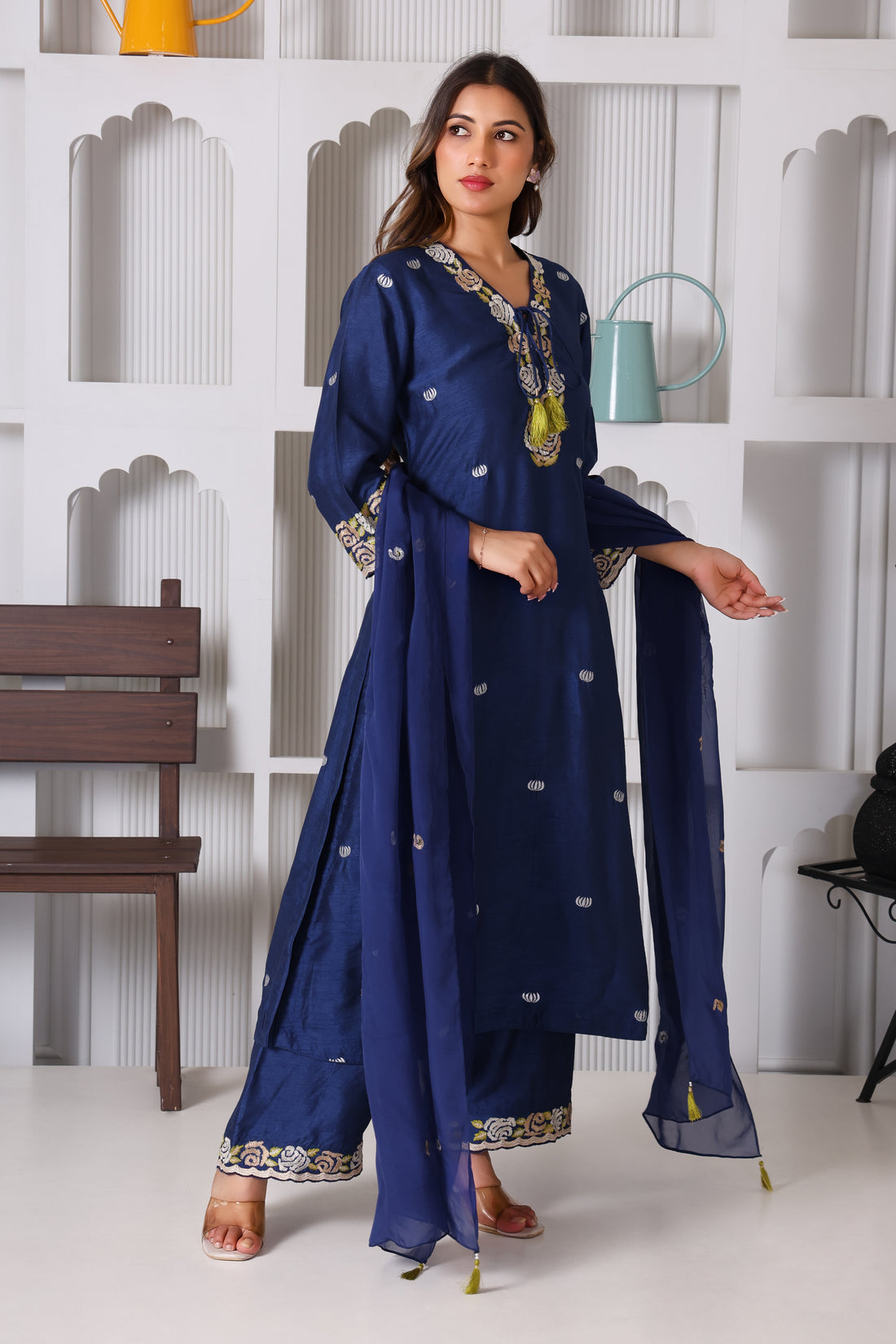 This traditional Indian suit features a long royal blue silk kurta with intricate machine embroidery...