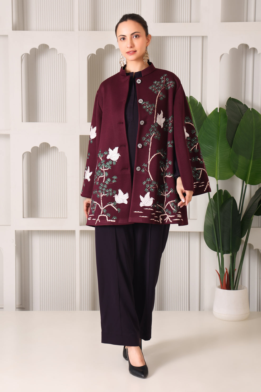Classic maroon coordinated set with embroidery stylish for day events or outings Wool-blend maroon set...