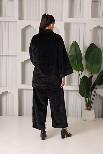 This Black Luxe Woolen Co-ord Set is designed for women who love power dressing with elegance. Crafted in premium velvet fabric, it features a relaxed silhouette that gives both comfort and sophistication.