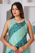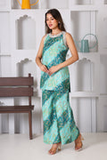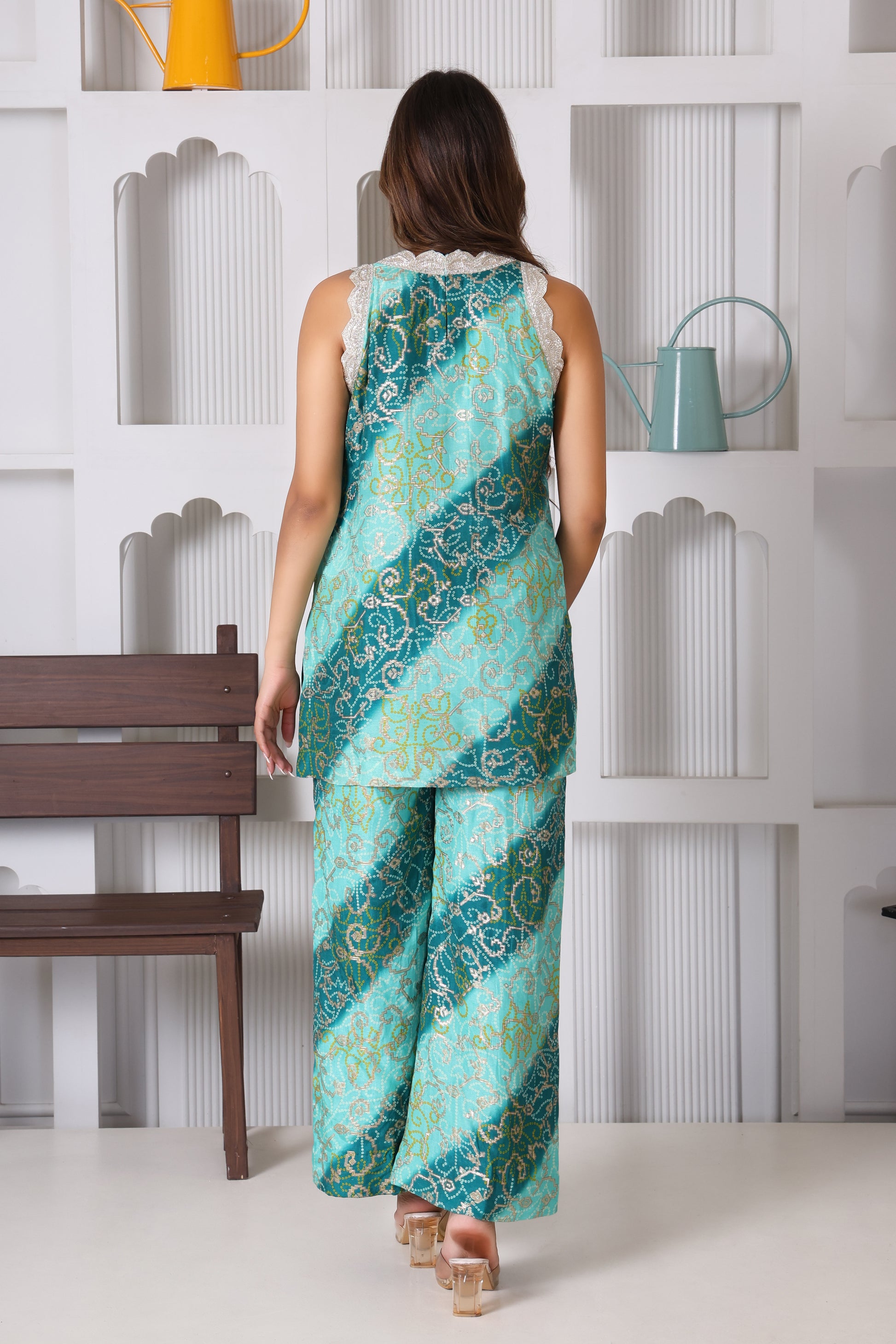 The co-ord set is crafted from exquisite silk brocade, featuring a stunning turquoise and gold patterned design. The intricate brocade weave adds depth and visual interest to the outfit, while the silk fabric provides a luxurious feel against the skin. The sleeveless top boasts a delicate white lace trim around the neckline, adding a touch of subtle elegance. The wide-leg pants are flowy and comfortable, making this co-ord set perfect for a special occasion or a sophisticated evening out.