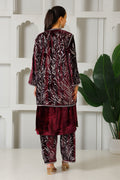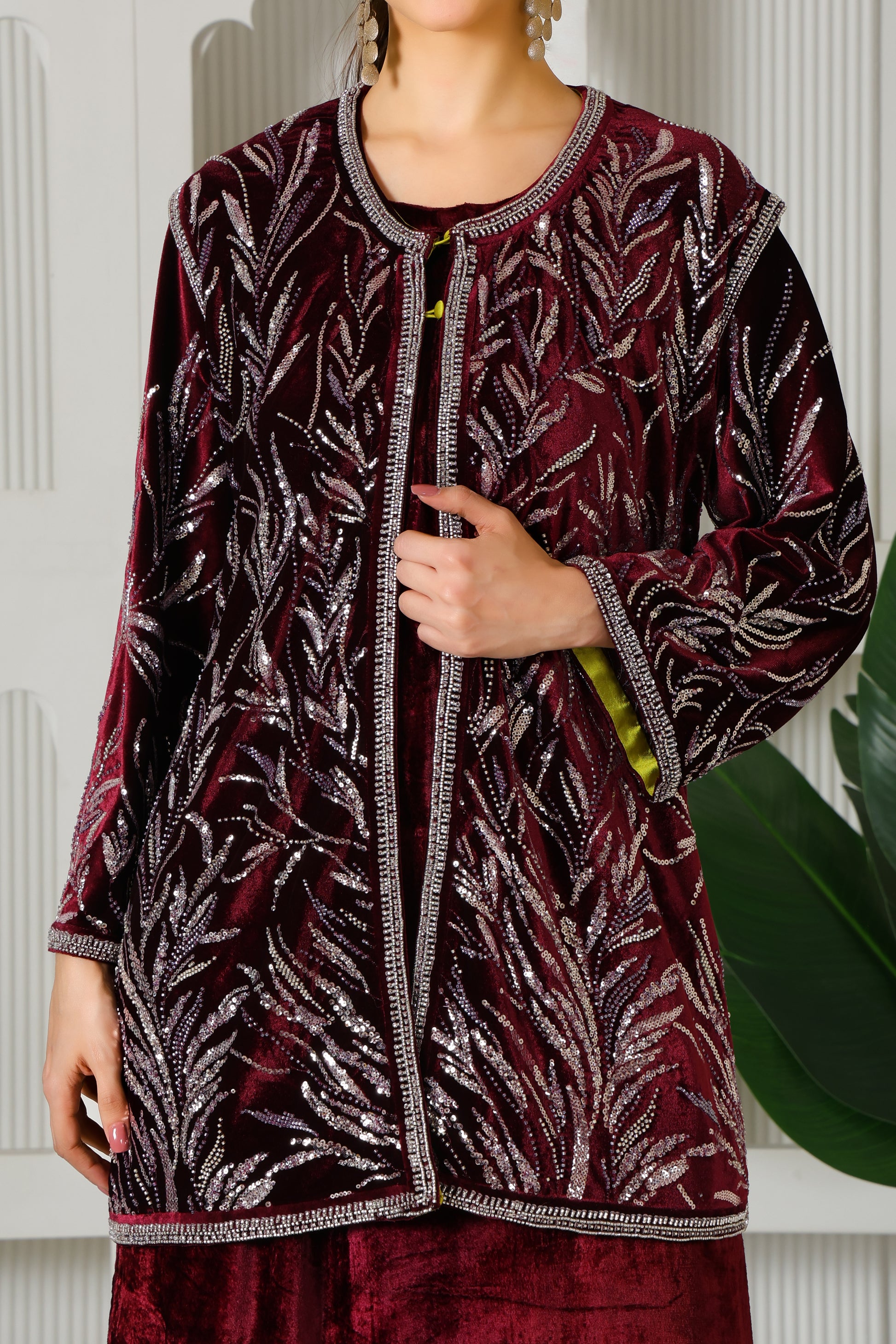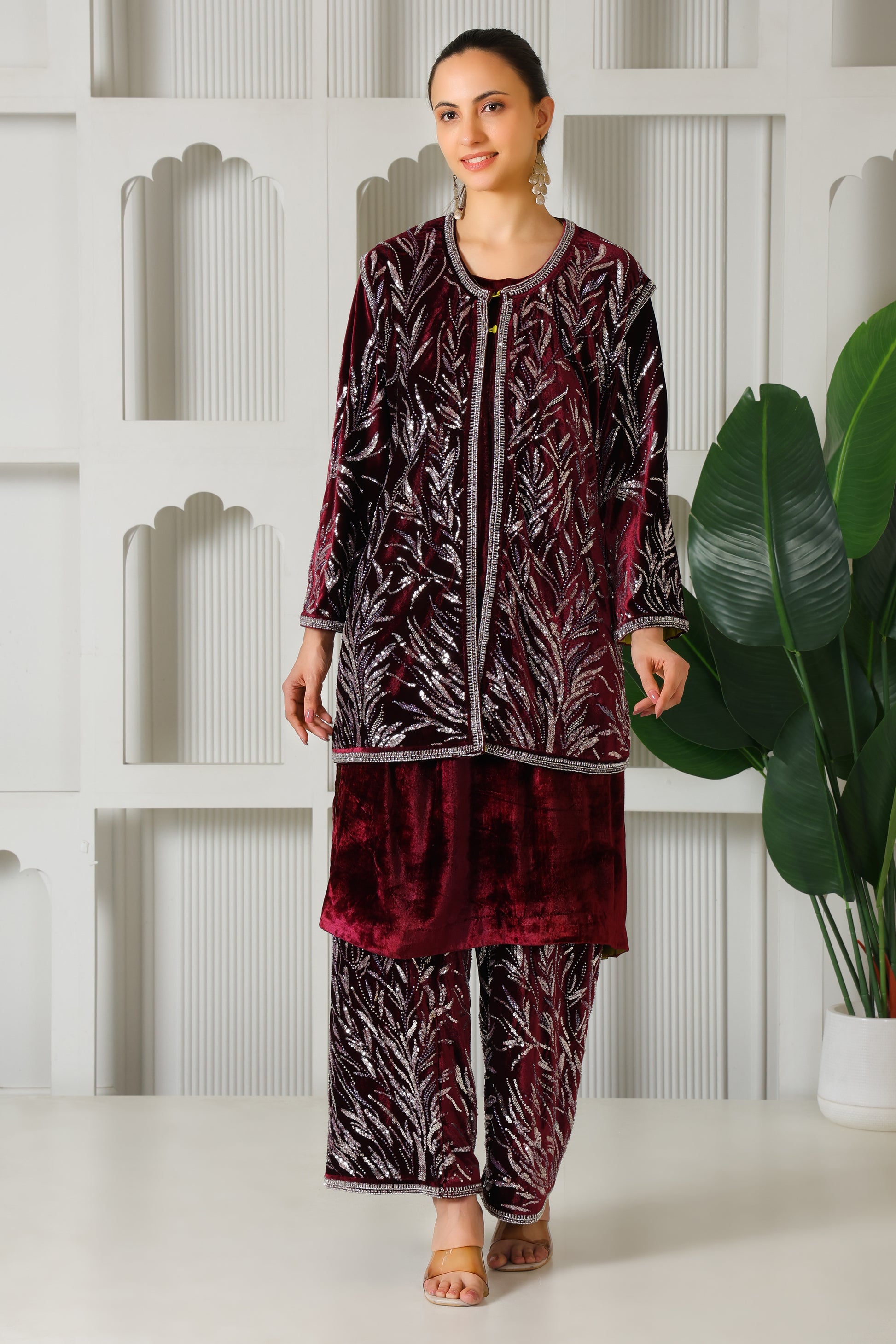 Classy Maroon Velvet Palazo Set hand embroidery, sequence & nalki work with long dupatta with jacket. Classic maroon color we can wear in winters in high class society you can wear in kiity & casual functions also .Lower palazo full length dupatta organza long dupatta with Nalki & sequence embroidery.