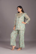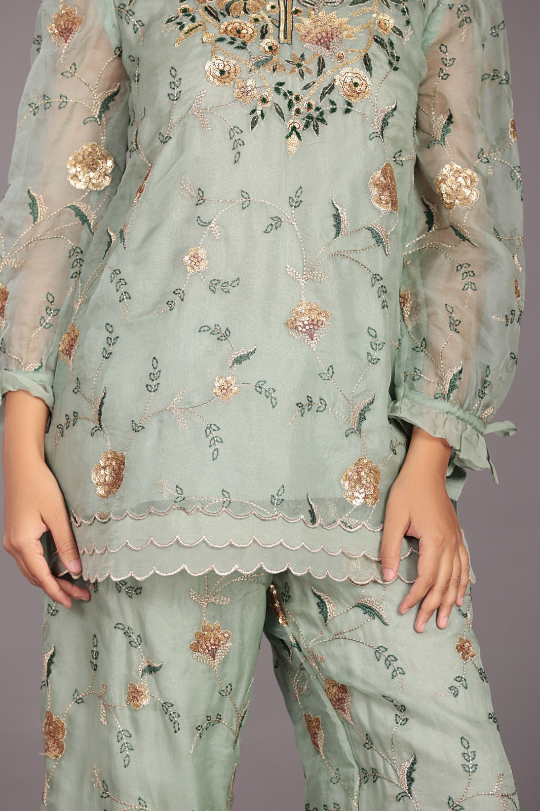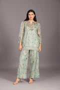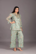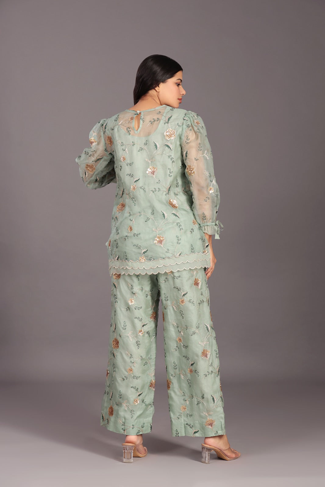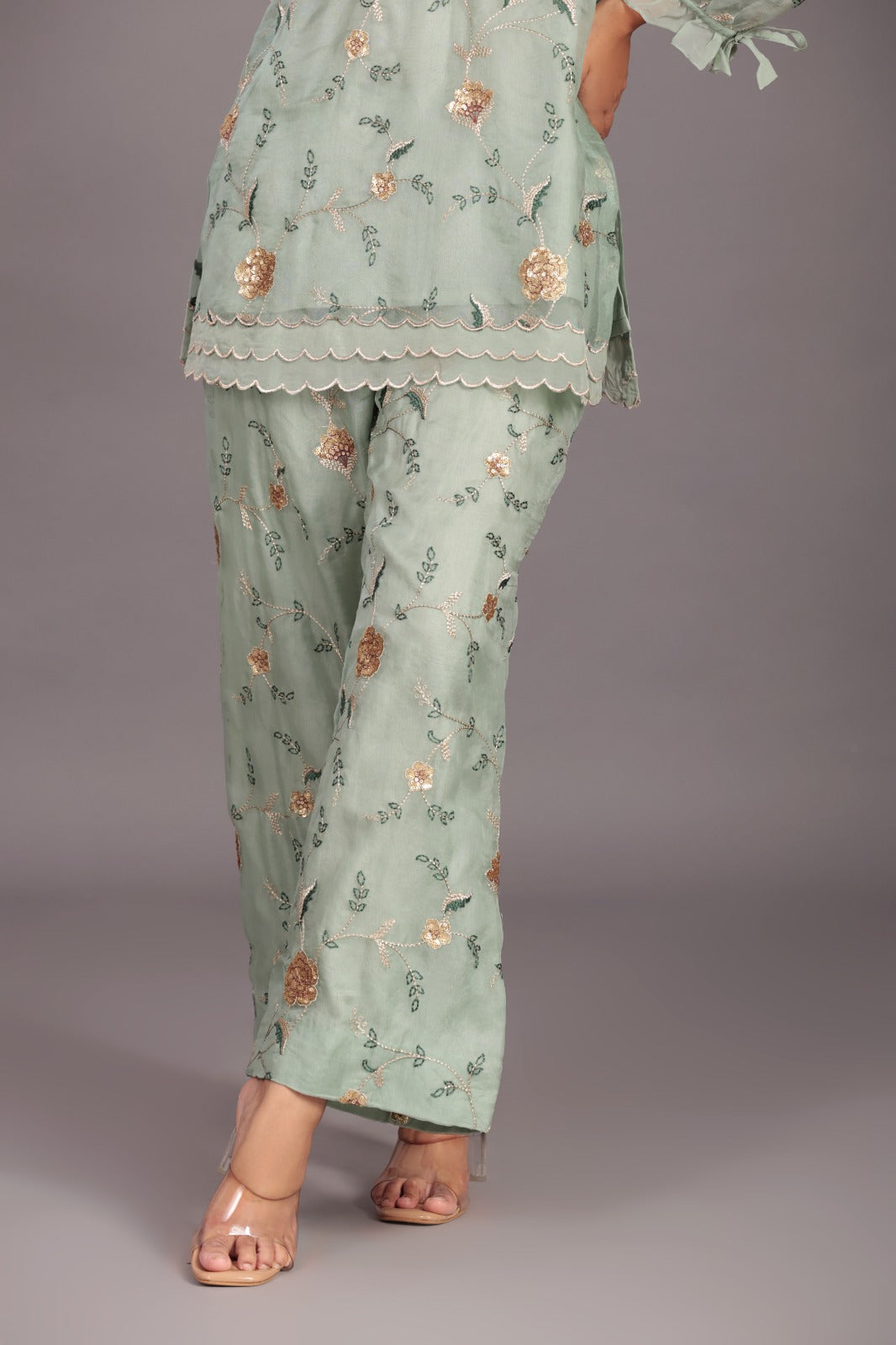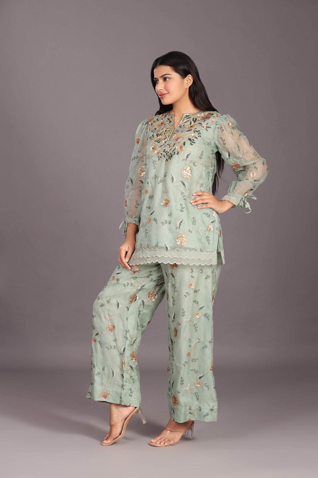 Classy Organza Light Emerald Co-ord Set Machine & Hand Embroidery Thread & Zari Work The wide-leg pants are flowy and comfortable, making this co-ord set perfect for a special occasion or a sophisticated evening out.