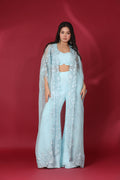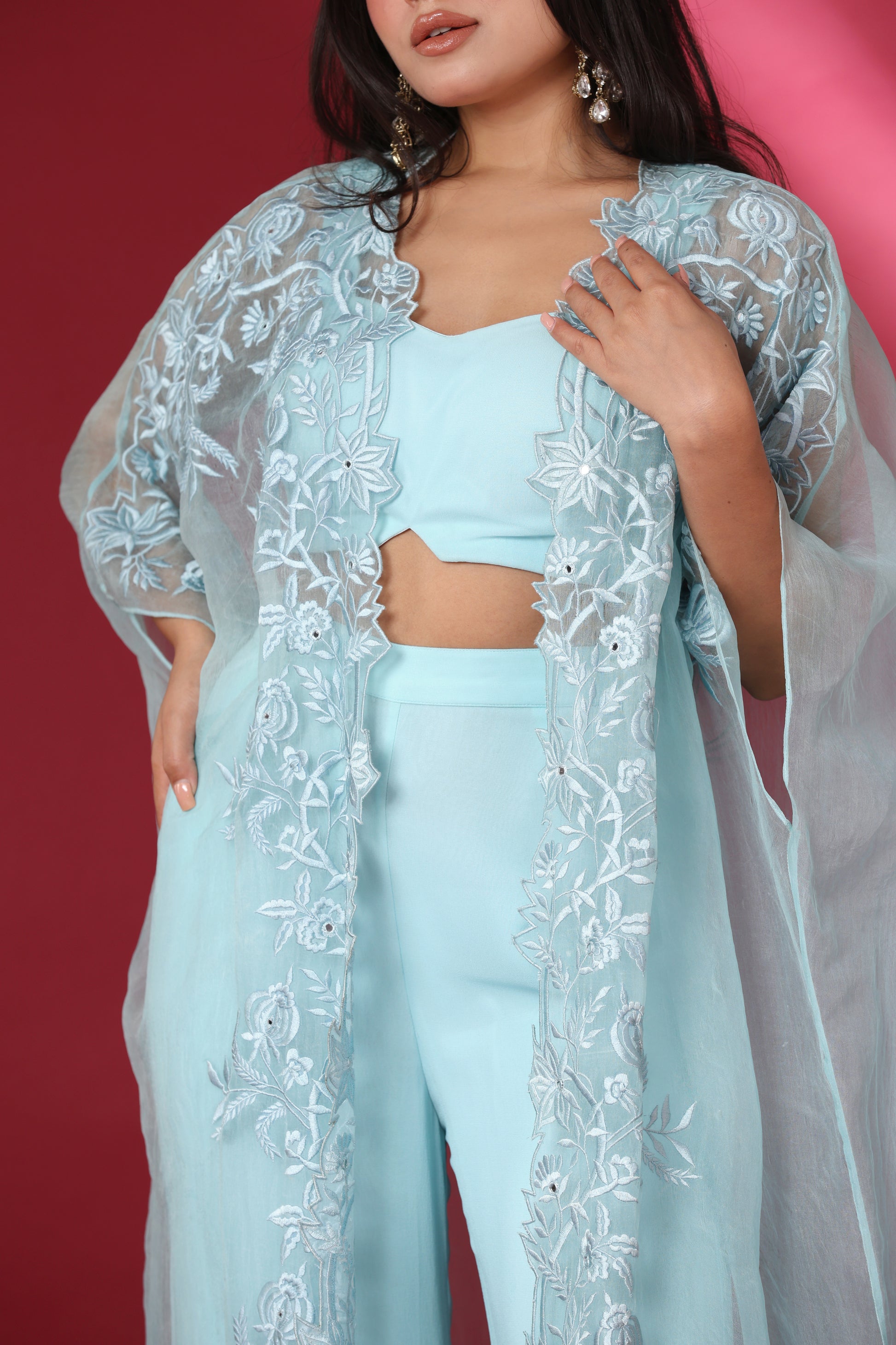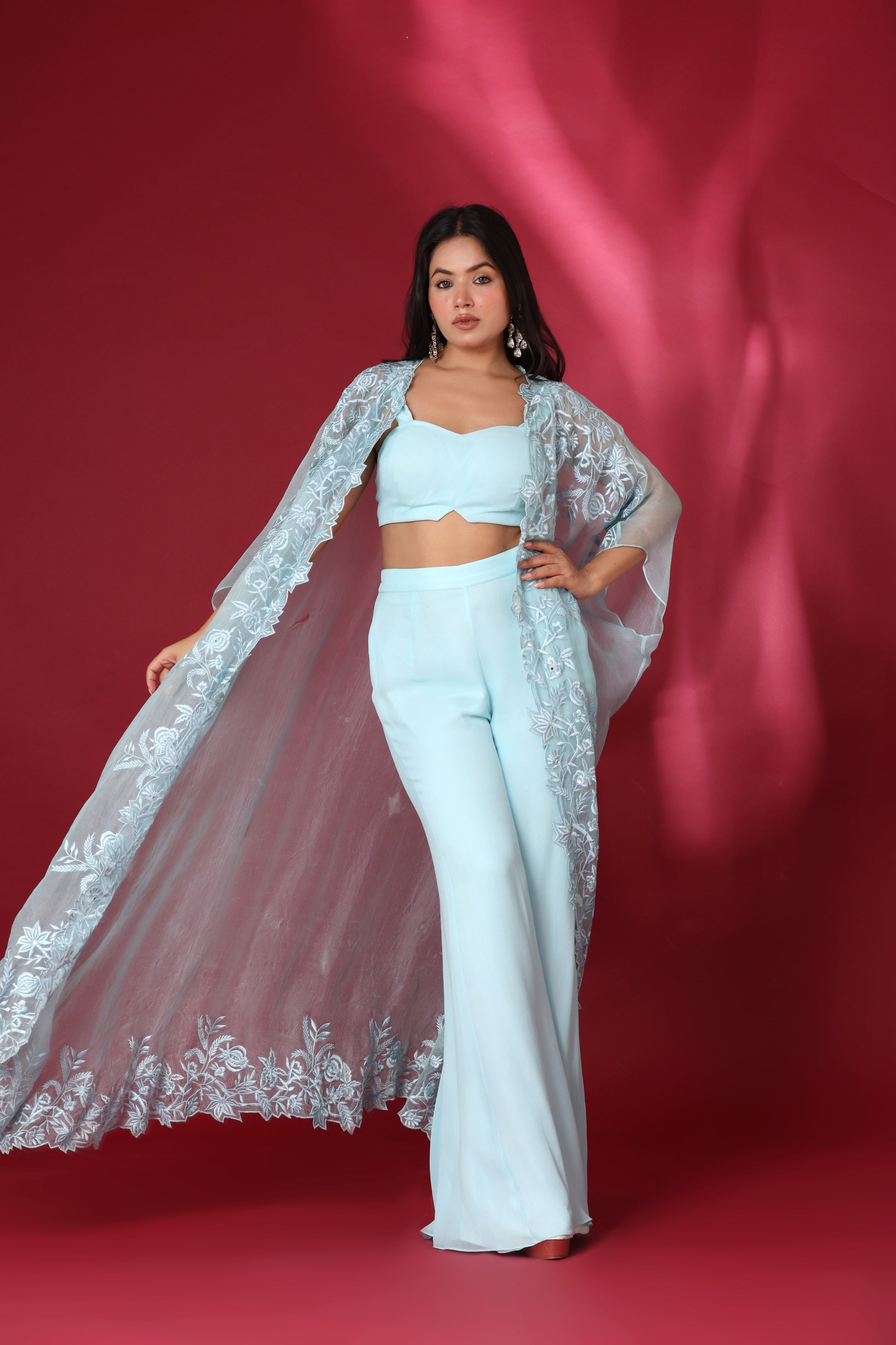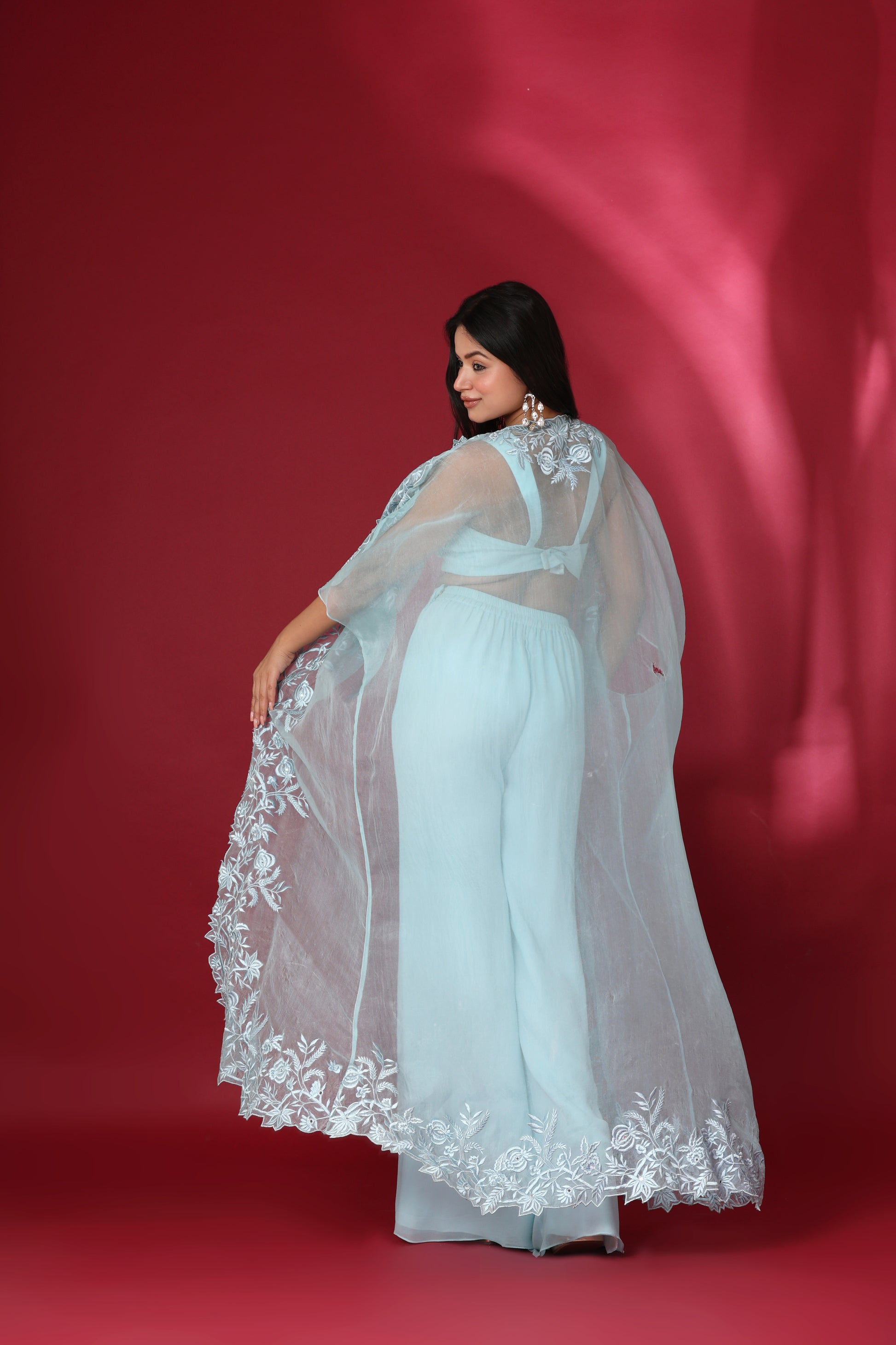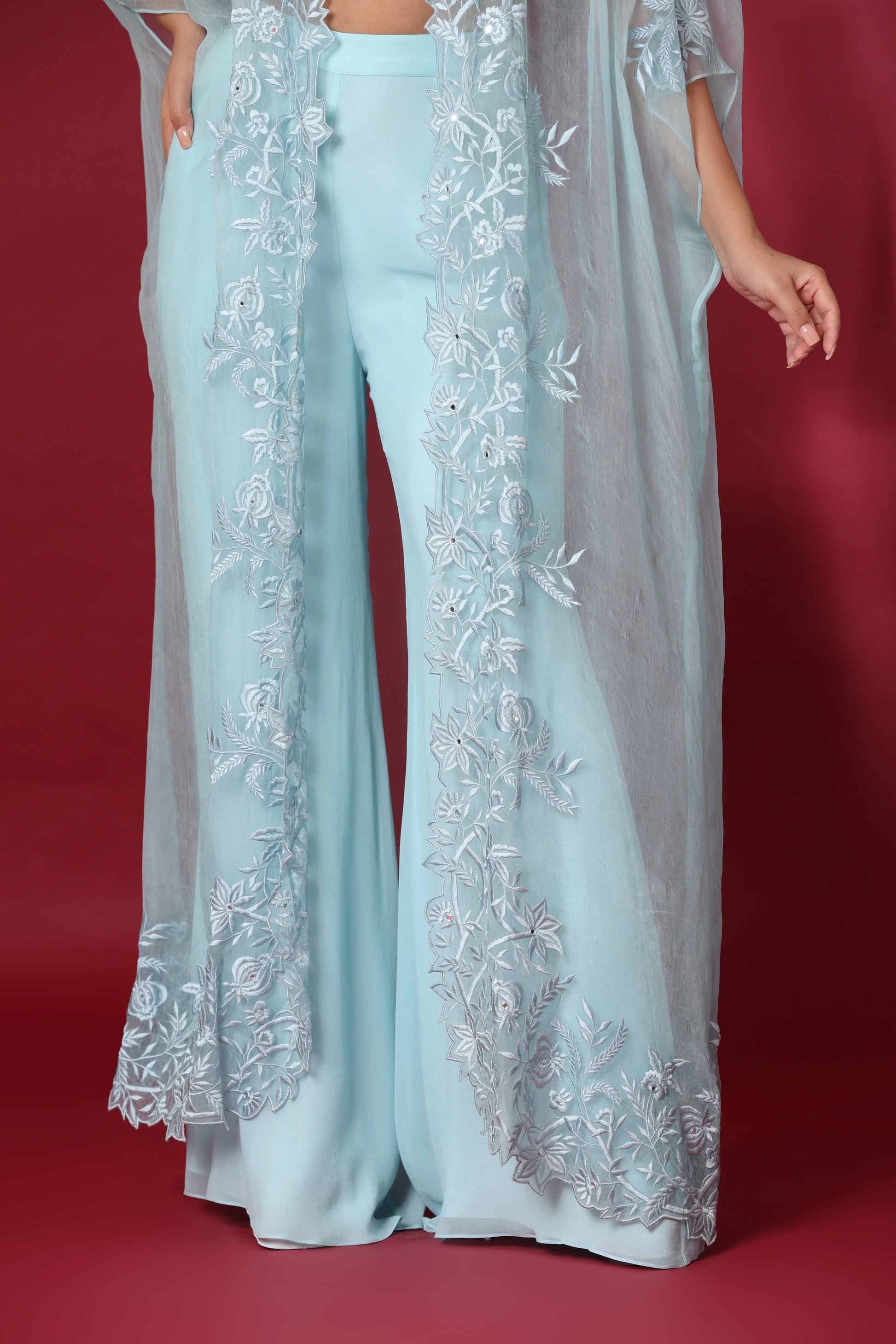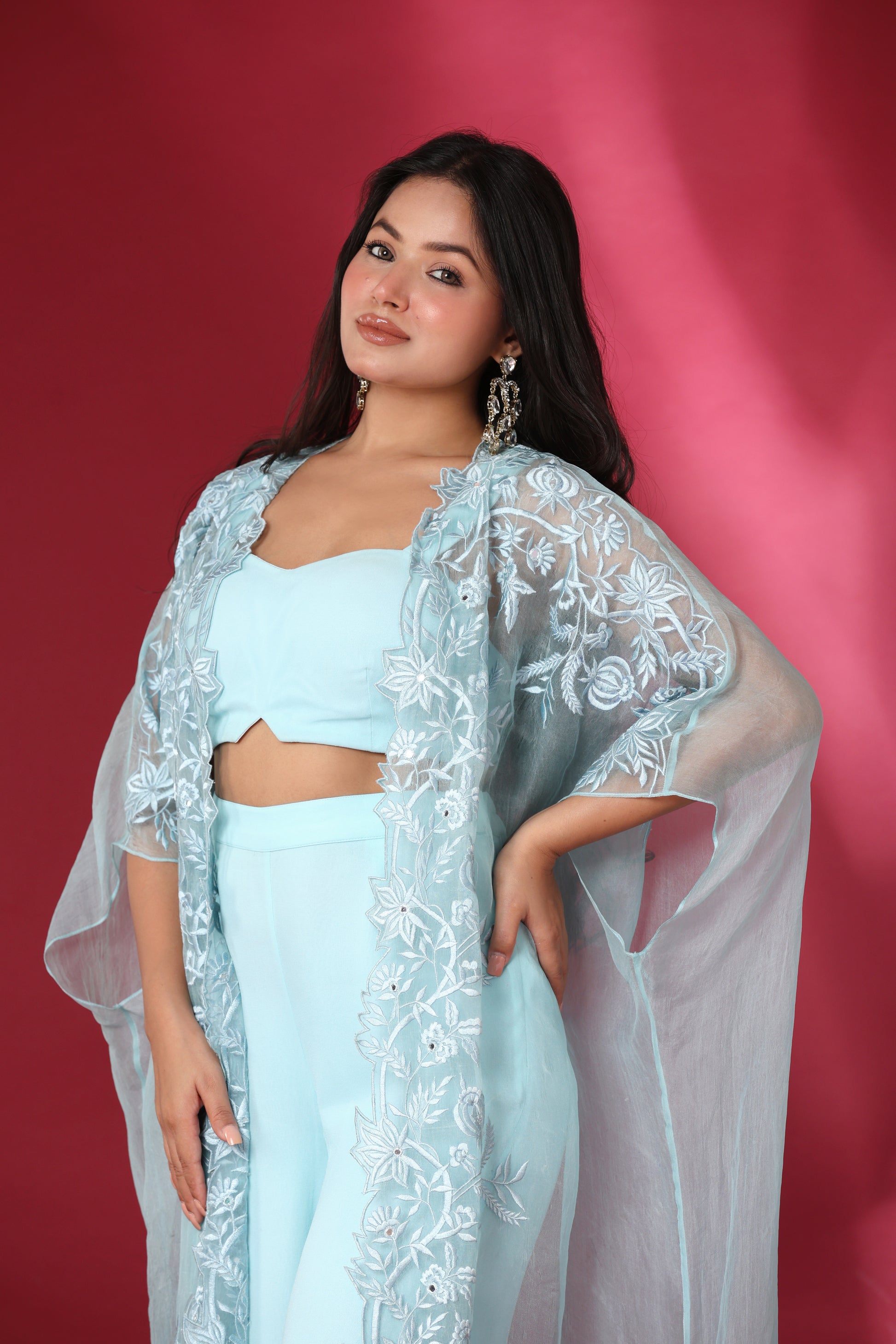 - A beautiful cape with intricate floral embroidery on delicate organza fabric, adding a touch of elegance.