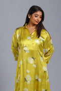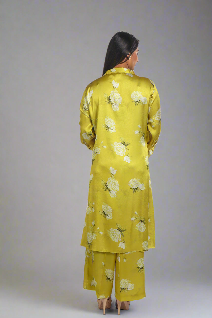 The top features a sleek collar neck and knee-length design with longer sides, creating a unique and flattering silhouette. Paired with the top are straight-fit pants that provide a streamlined contrast.