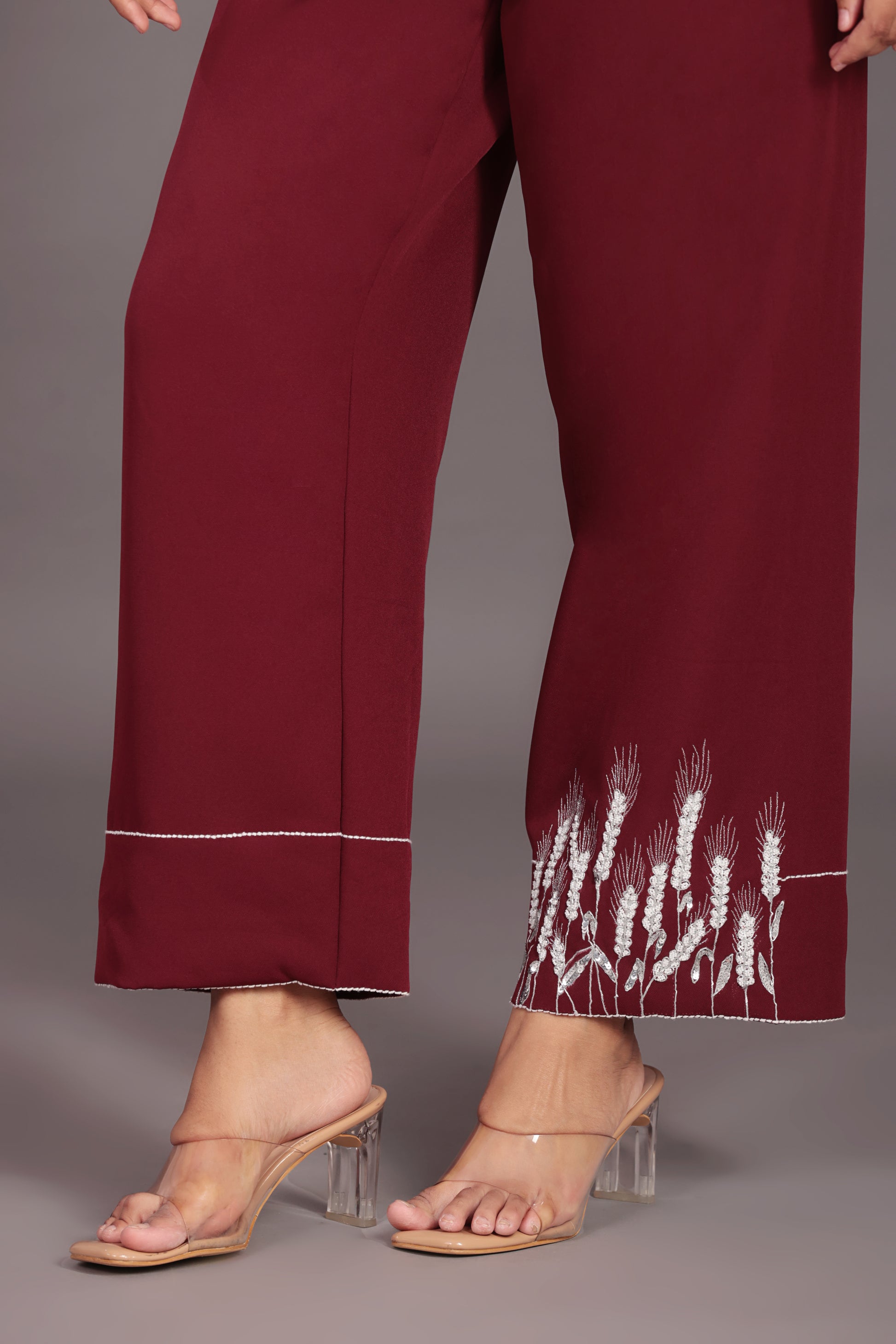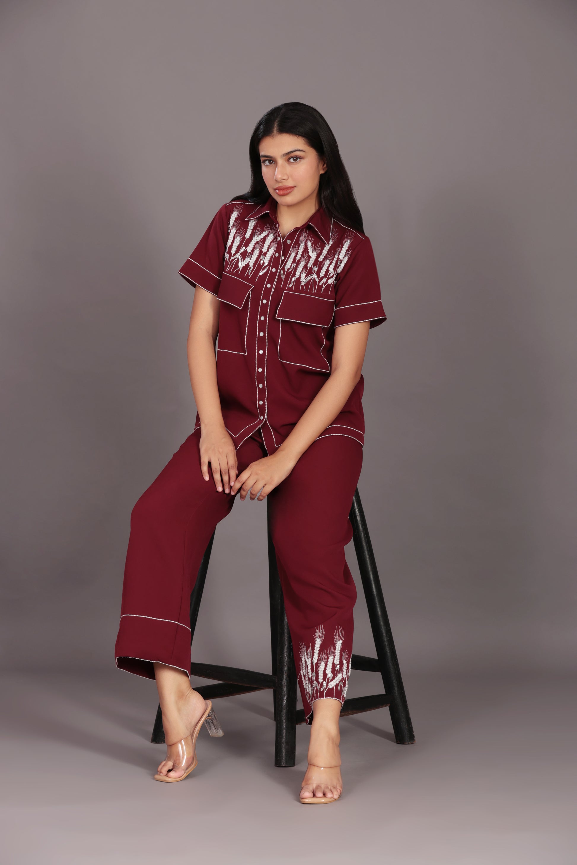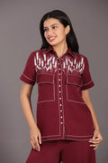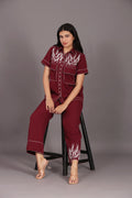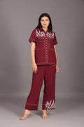 Maroon Classy Co-ord Set fabric banana crape hand embroidery zari,sequence & moti work elegant & classy co-ord shirt is half sleeves georgeous & elegant attractive maroon color we can wear in everywere like kitty parties,birthdays parties & travelling also. Lower type of ankle length pant & hand and machine embroidery zari,sequence & moti.