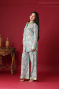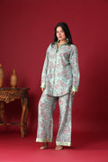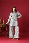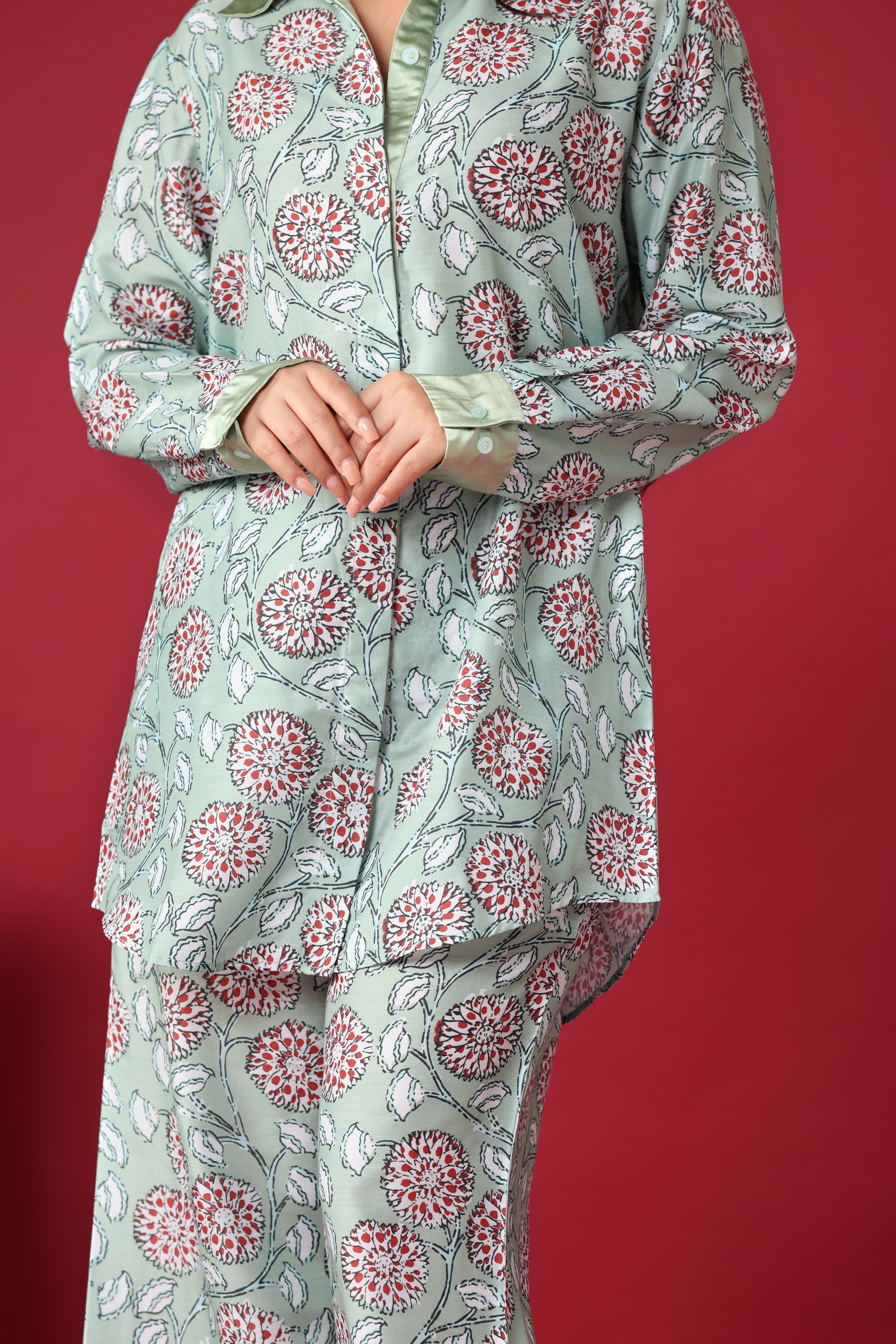 Crafted from lightweight georgette, this mint green floral co-ord set offers an elegant drape and comfortable fit. The red flowers with white centers and green leaves create a striking contrast against the soft background. Satin trim on the collar, cuffs, and hem adds refined sophistication, making this set ideal for both relaxed lounging and stylish errands. Its blend of comfort and polished detail ensures a versatile addition to your wardrobe.