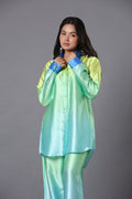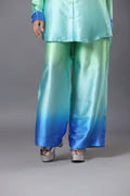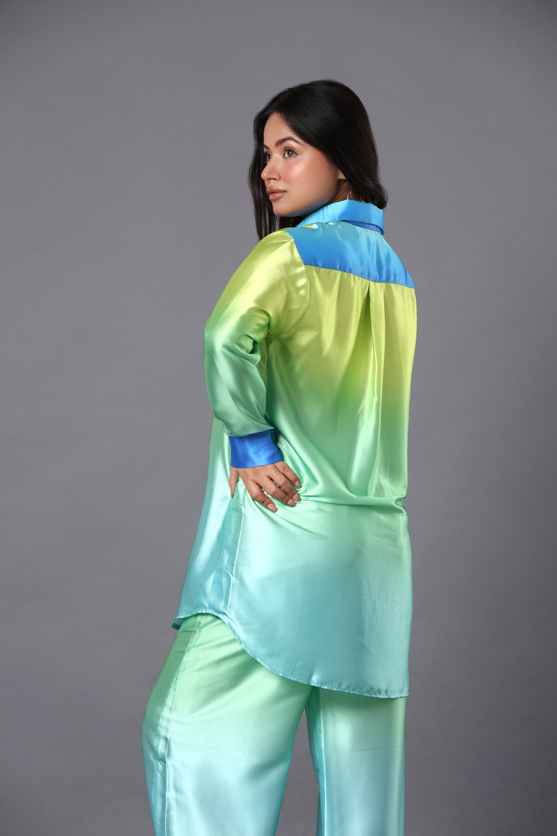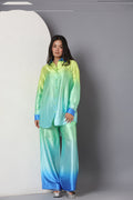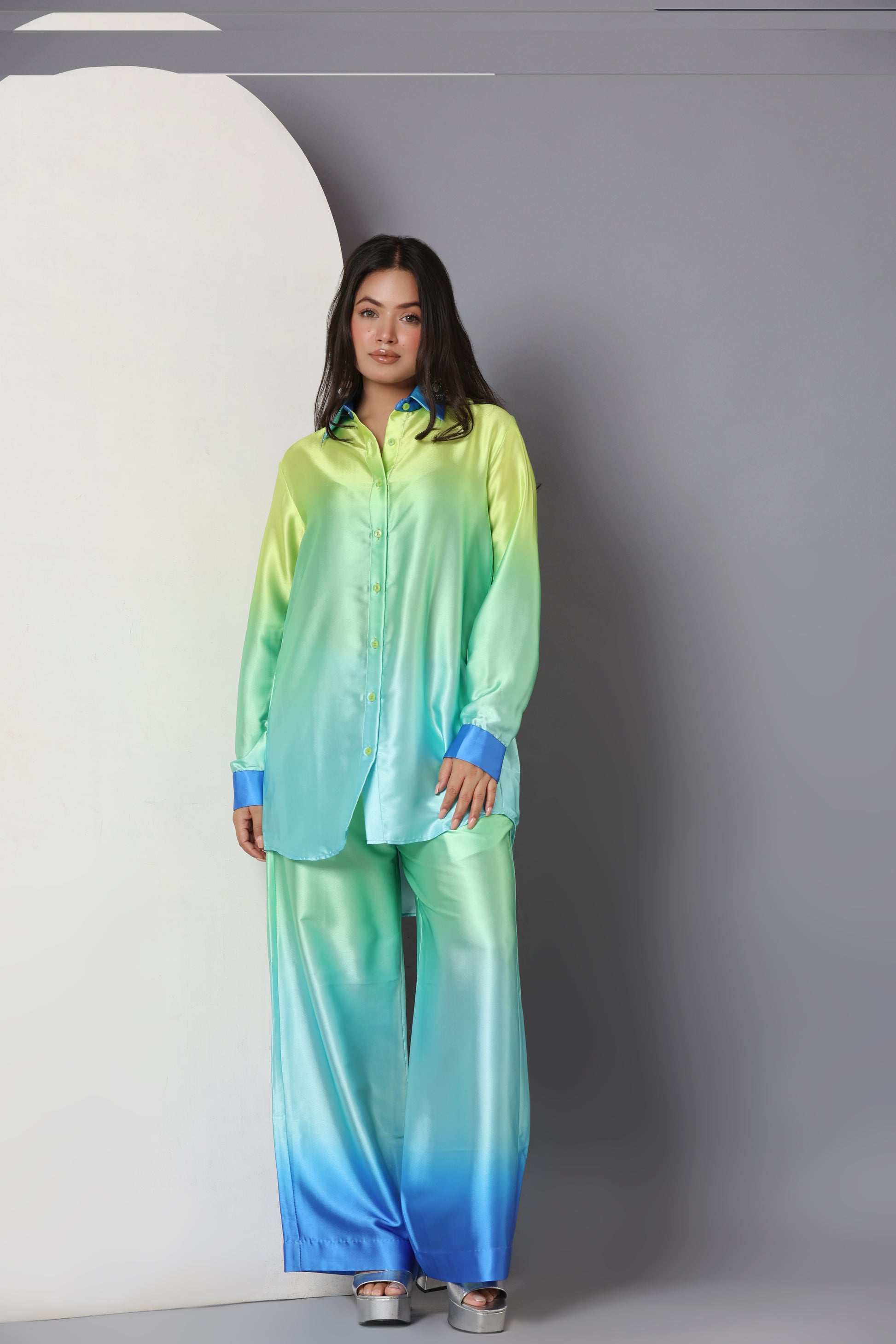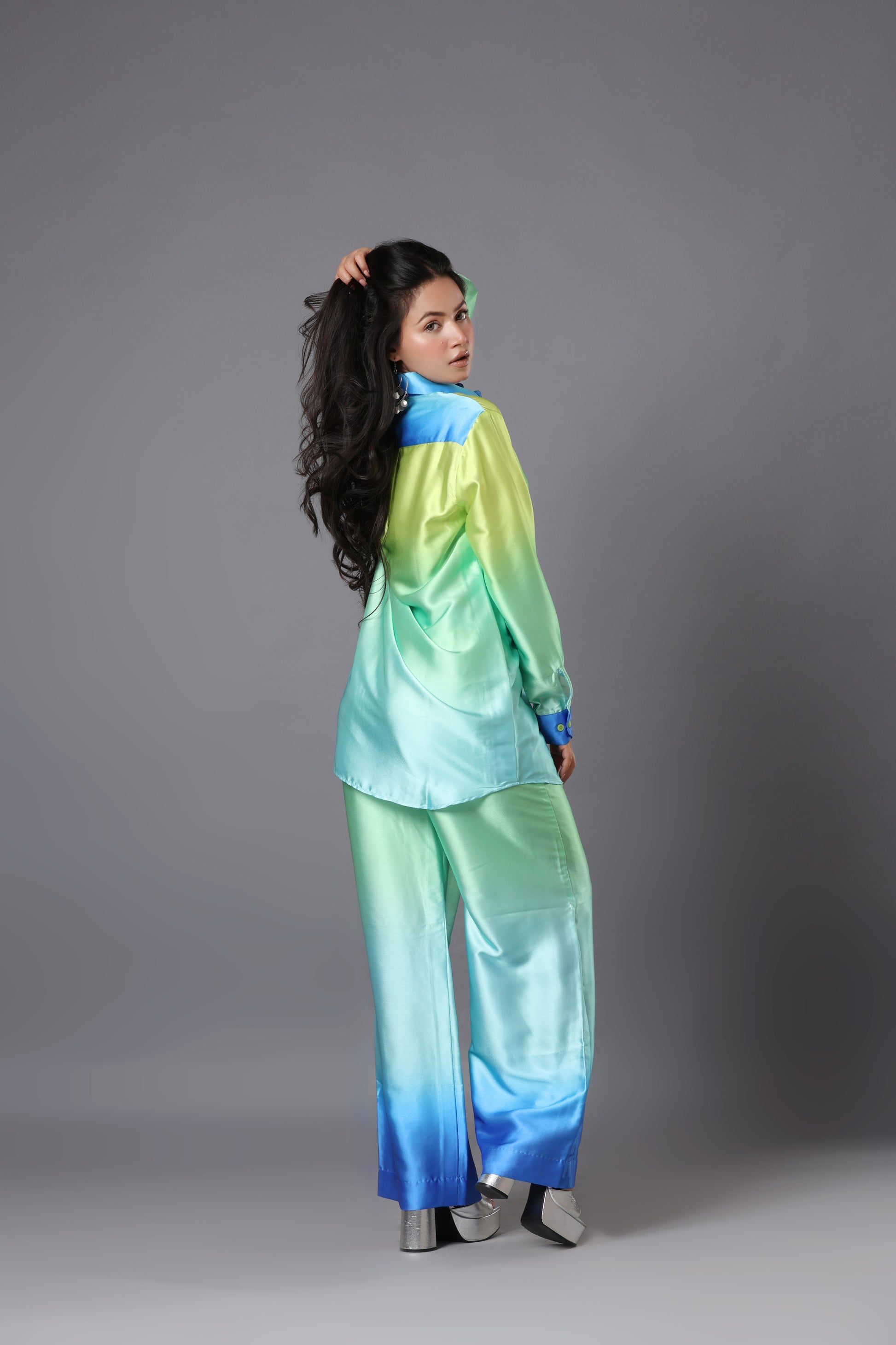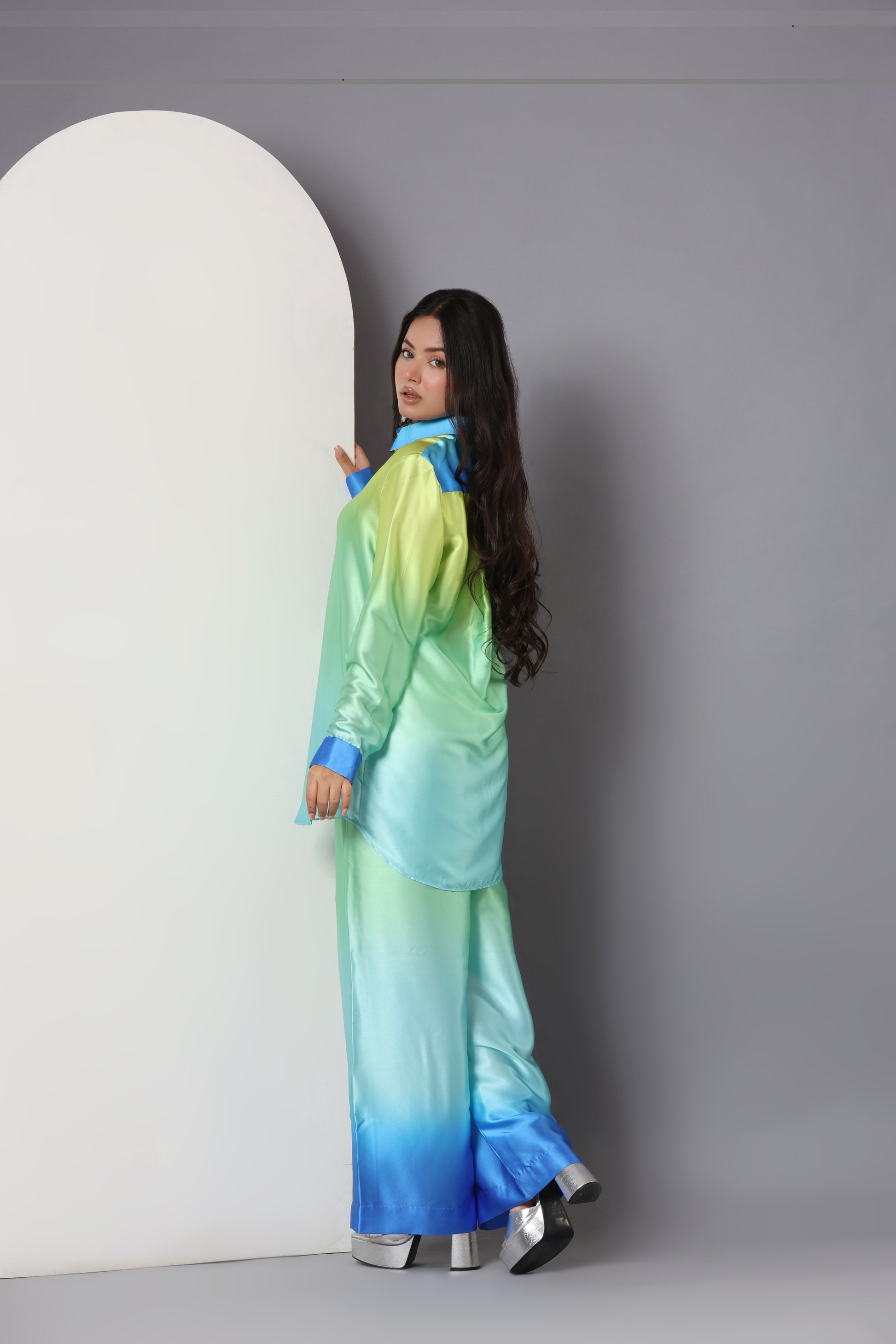 The woman in the image is wearing a co-ord set consisting of a long-sleeved shirt and wide-leg pants. The outfit features a gradient color scheme that transitions from light green at the top to blue towards the bottom, creating a visually appealing ombre effect. The shirt has a collar and buttons down the front, while the pants have an elastic waistband for comfort. The overall design exudes a sense of modernity and style, making it suitable for various occasions.