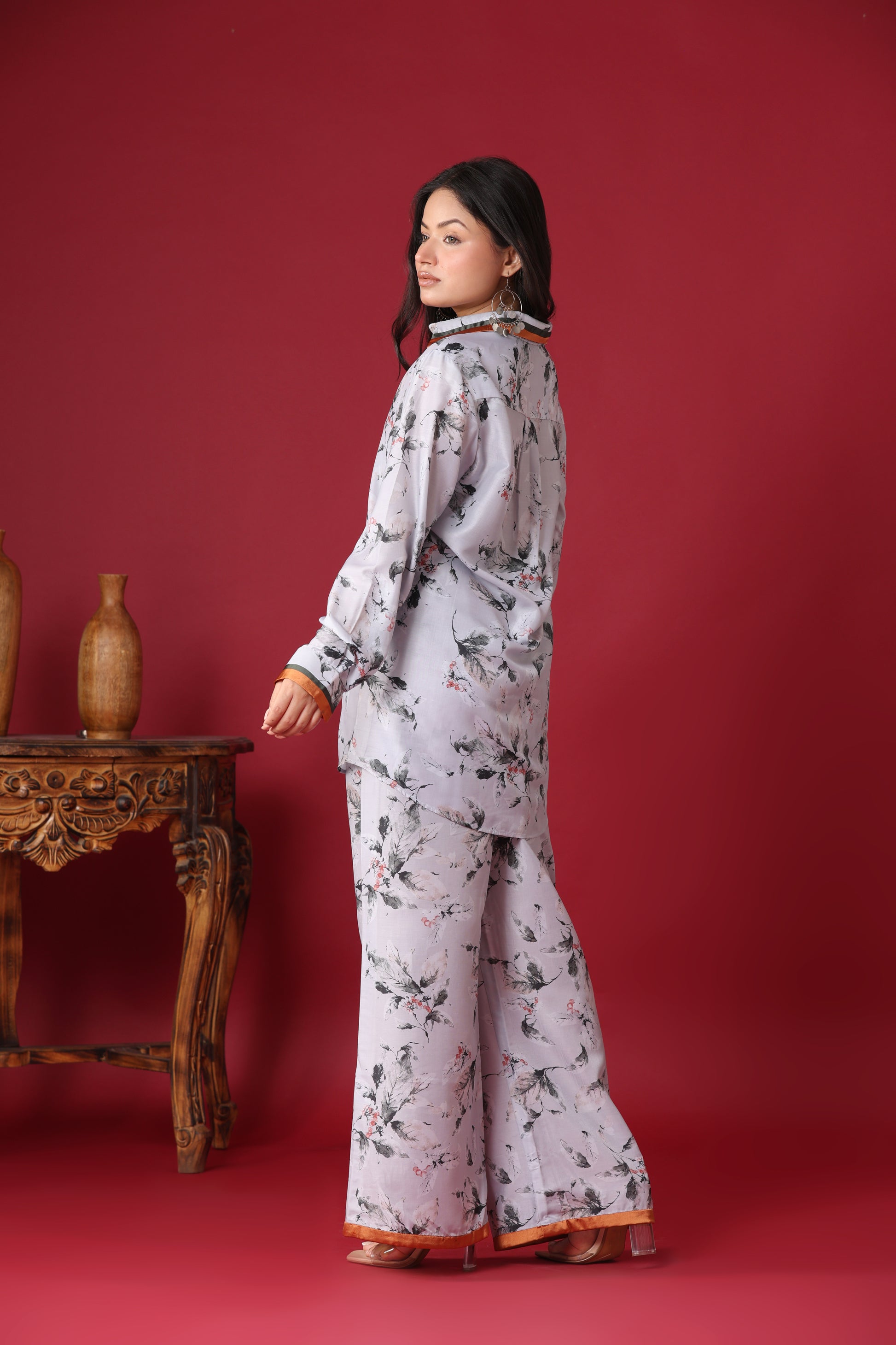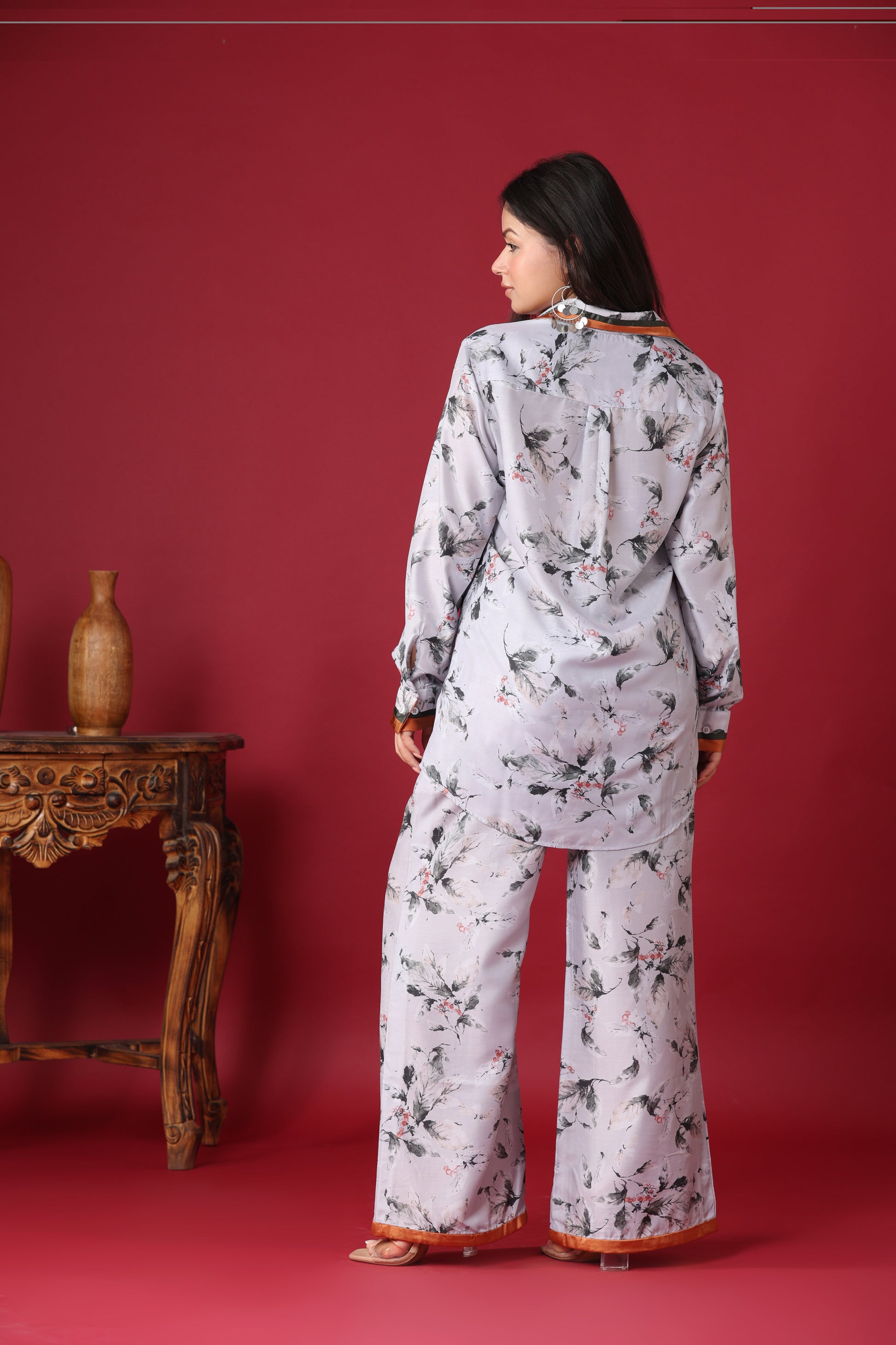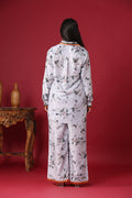 * Overall Aesthetic: The co-ord set exudes an effortless elegance with a relaxed, chic vibe. The soft colors and gentle floral print give it a serene and sophisticated appeal, suitable for casual outings, relaxed gatherings, or even as comfortable yet stylish loungewear. The contrasting trim on the pants adds a touch of understated luxury.