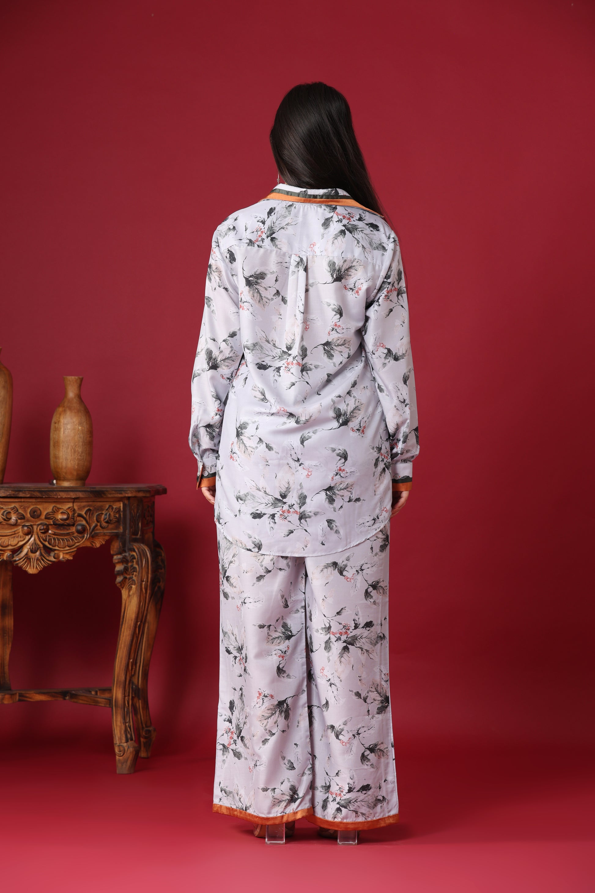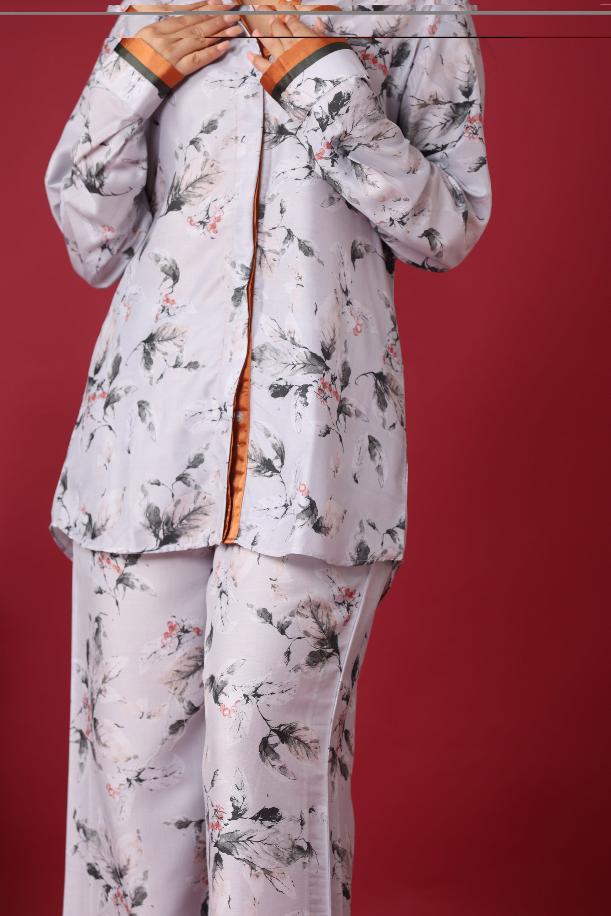 * Bottom: The bottom consists of wide-leg trousers that perfectly match the print and fabric of the top. They offer a relaxed fit, ensuring ease of movement and comfort. The hem of the trousers appears to have a contrasting border, possibly in a subtle orange or rust color, adding a refined detail.