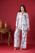 The set features a delicate light grey or lavender-grey base color adorned with a subtle yet intricate floral print. The print appears to be in muted tones of green, possibly some light pinks or purples, and darker accents, creating a graceful, painterly effect.