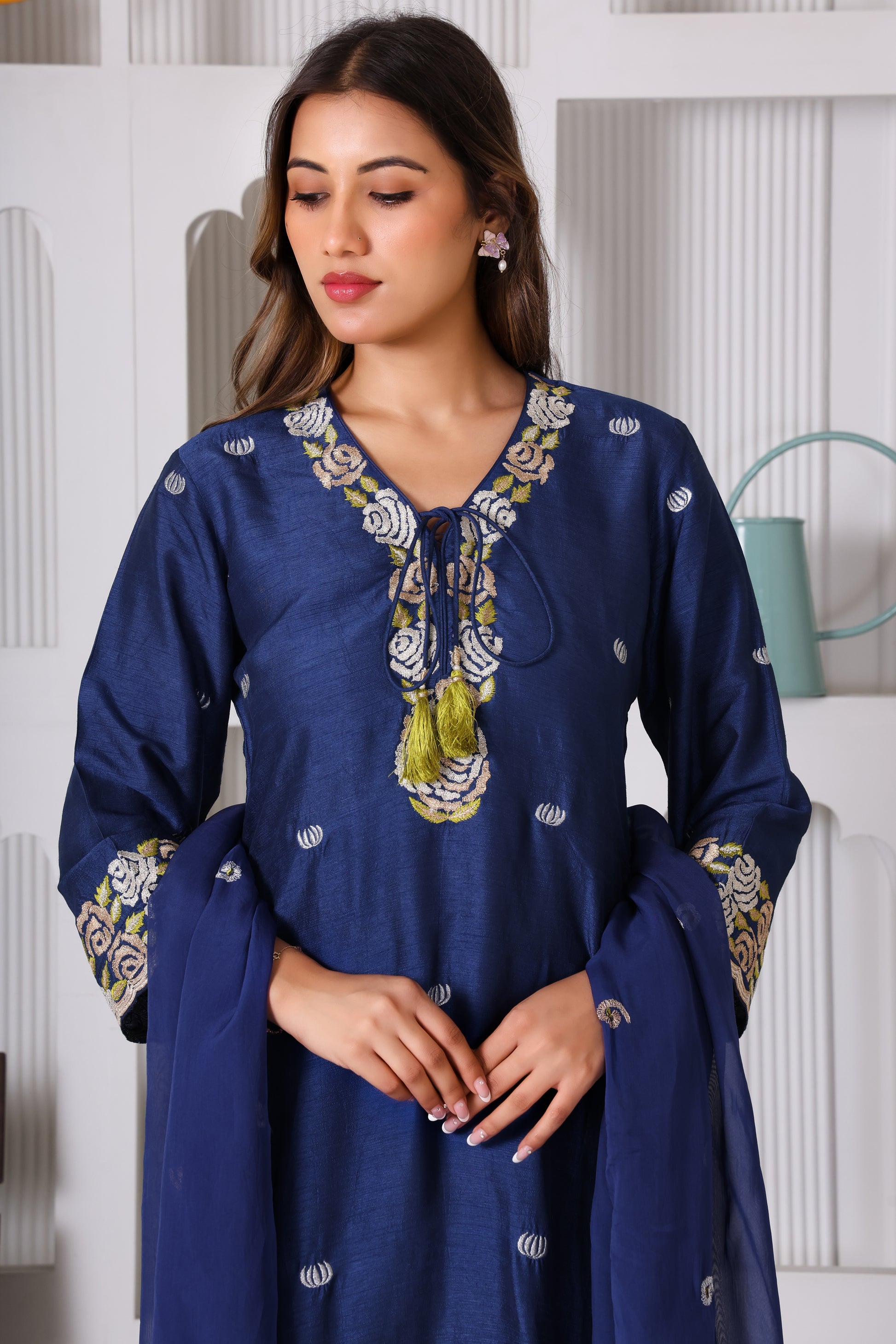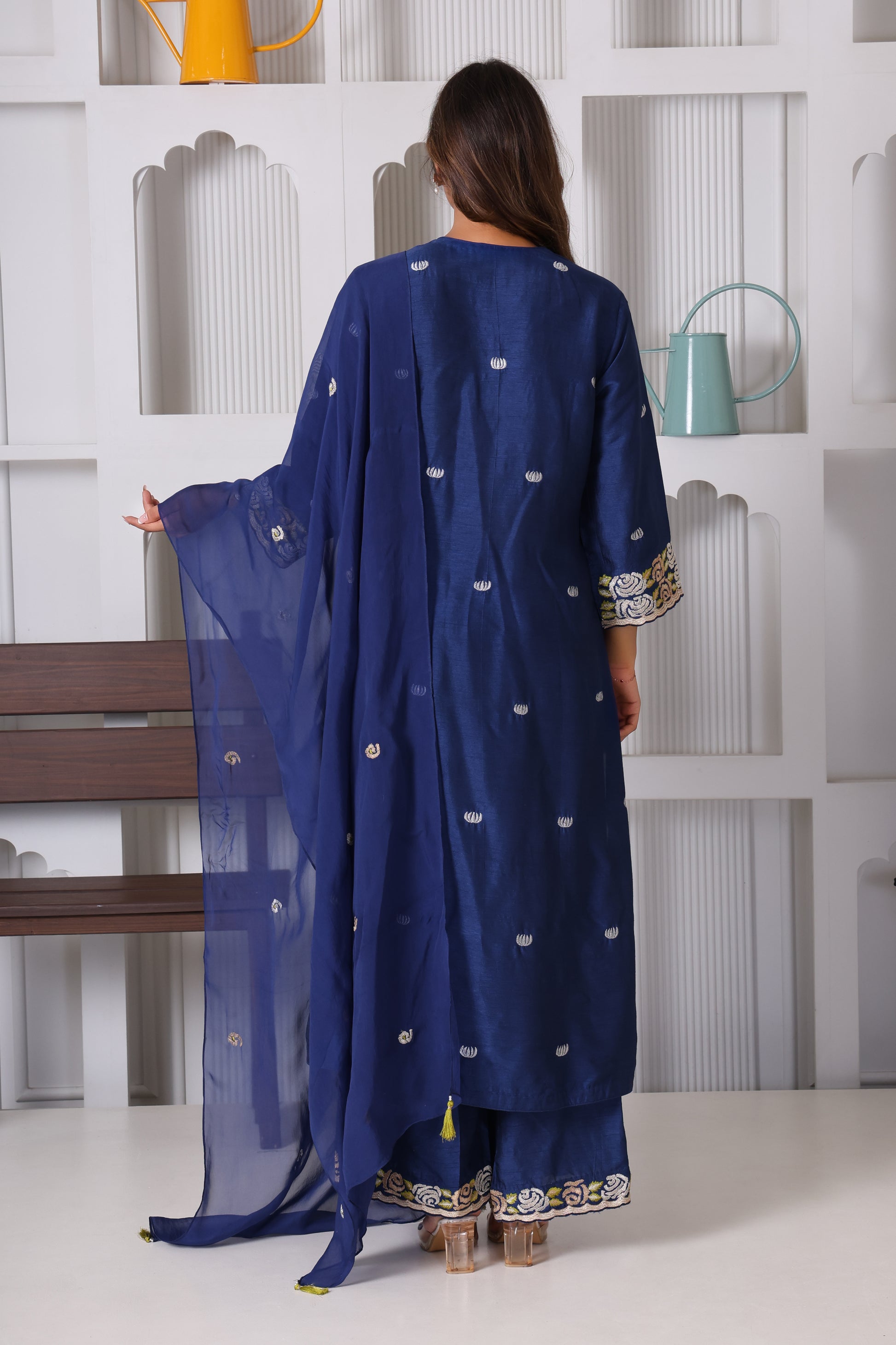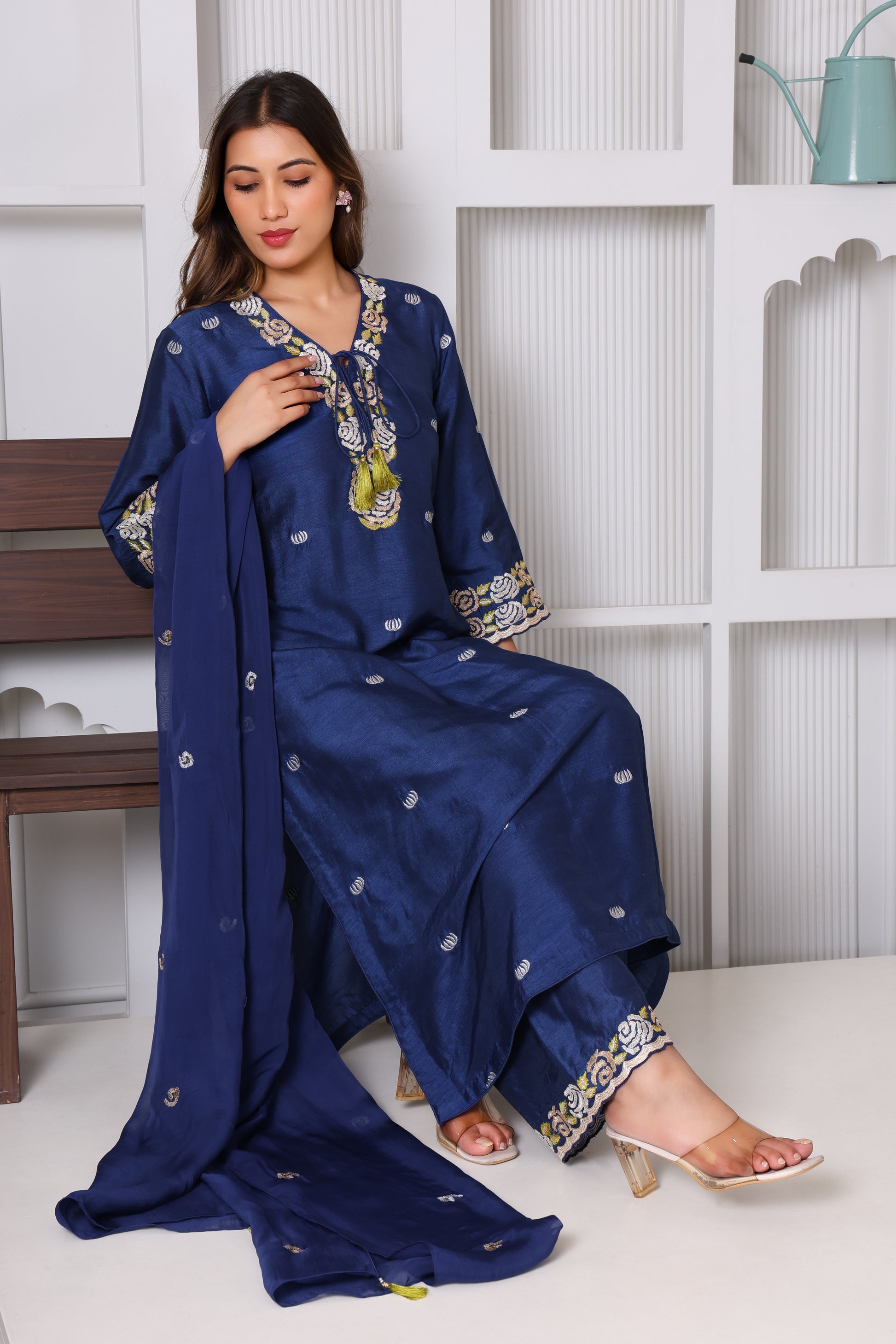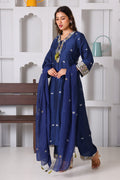 This traditional Indian suit features a long royal blue silk kurta with intricate machine embroidery on the front, sleeves, and neckline, paired with matching pants and a tassel-adorned dupatta. The rich color and luxurious fabric make it ideal for formal occasions, while the detailed embroidery and tassels enhance its elegant appeal, reflecting expert craftsmanship and cultural heritage.