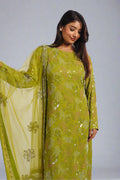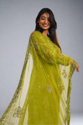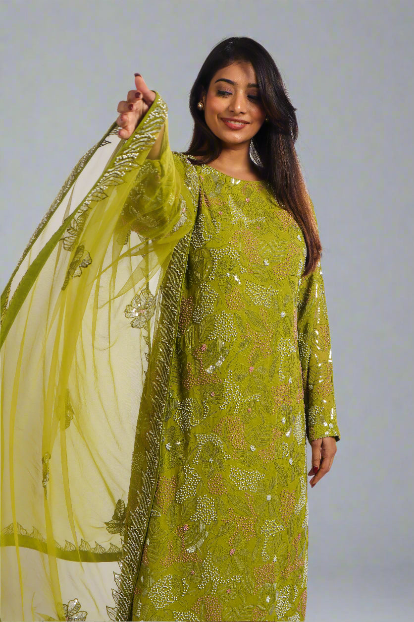 The kurta itself is a work of art, featuring intricate and exquisite fully hand embroidery that covers the entire garment. The full sleeves add a touch of elegance, while the soft crape lining provides comfort and luxury. Paired with the kurta are plain crape pants that offer a sleek and sophisticated contrast. Completing the set is a stunning dupatta, also adorned with intricate fully hand embroidery