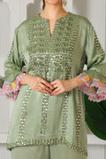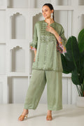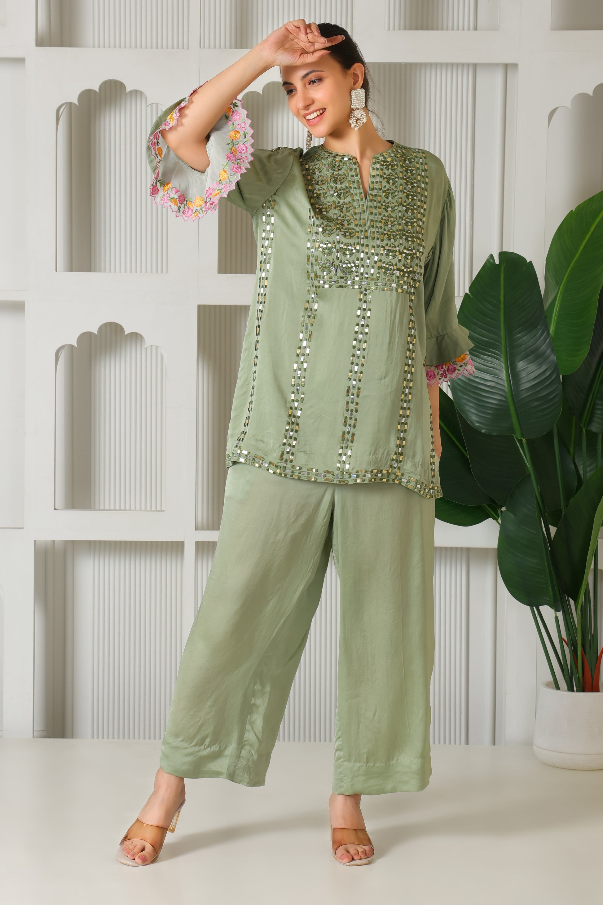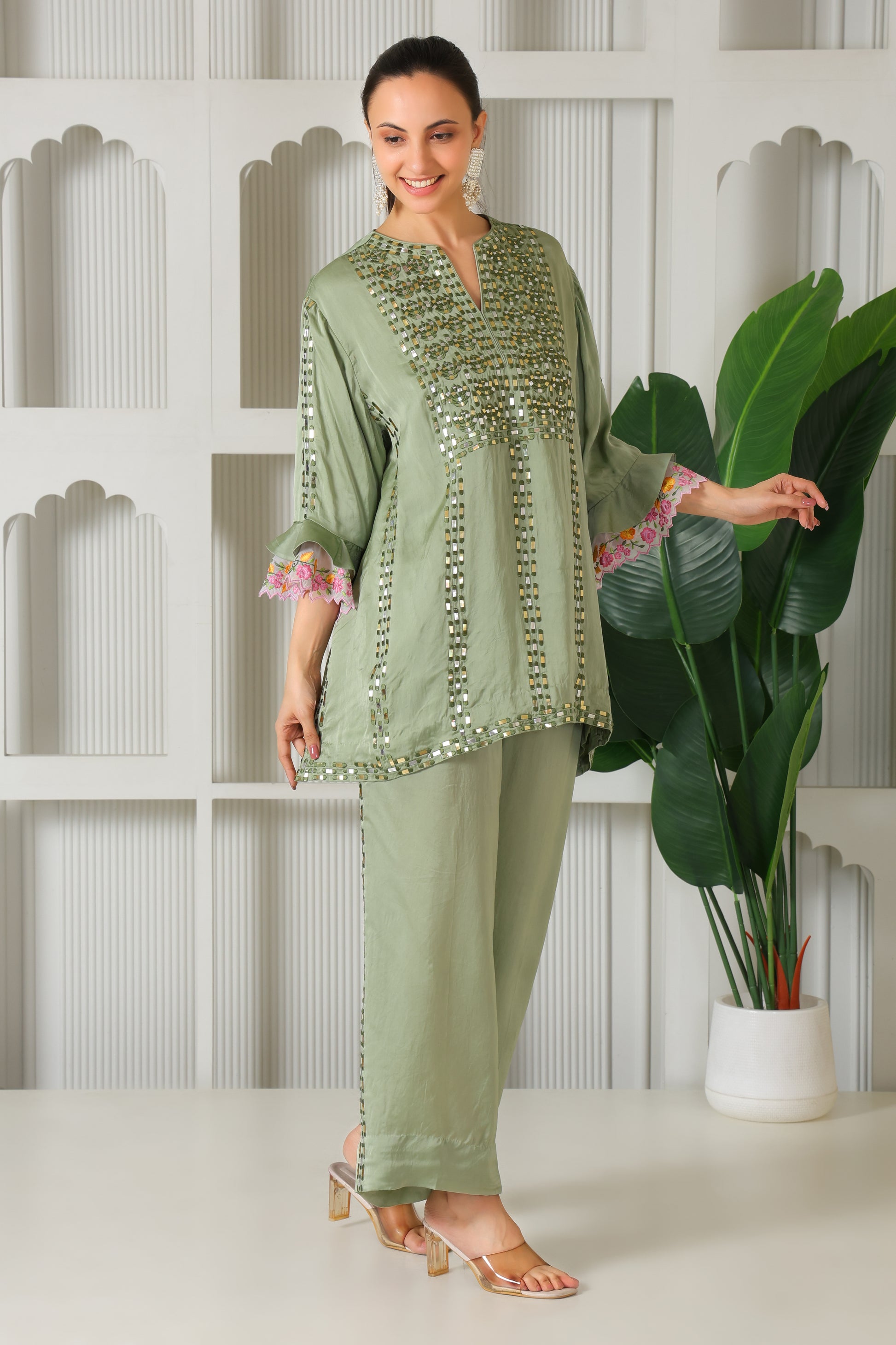 Green Mirror Look Co-ord Set machine embroidery with thread work light green color elegant soft to skin touch Can wear in Kitty Parties, Evening Party & Casual High Class Wear also waist Lenght shirt Comfortable Fitting ankle lenght pant cut work design.