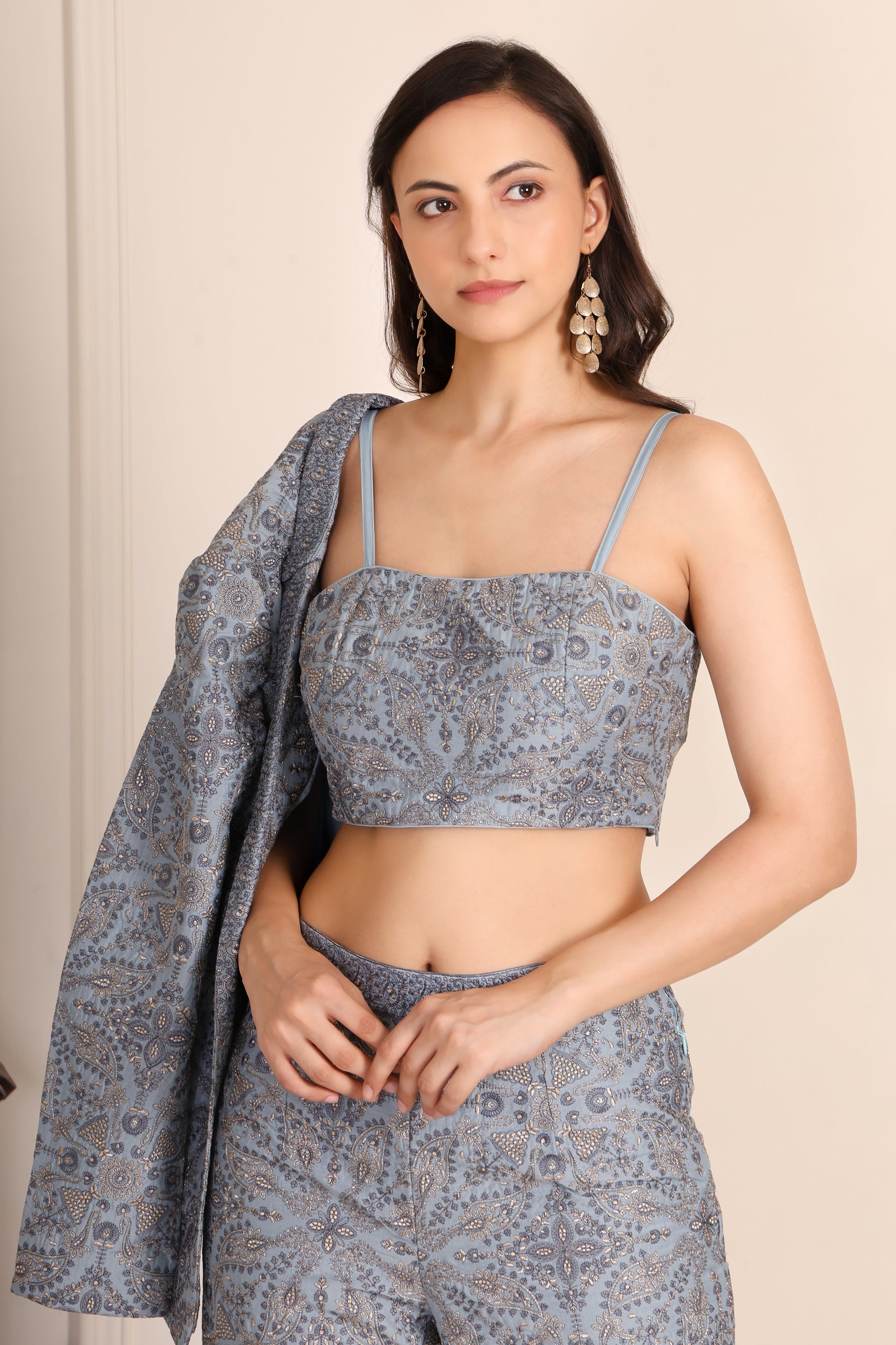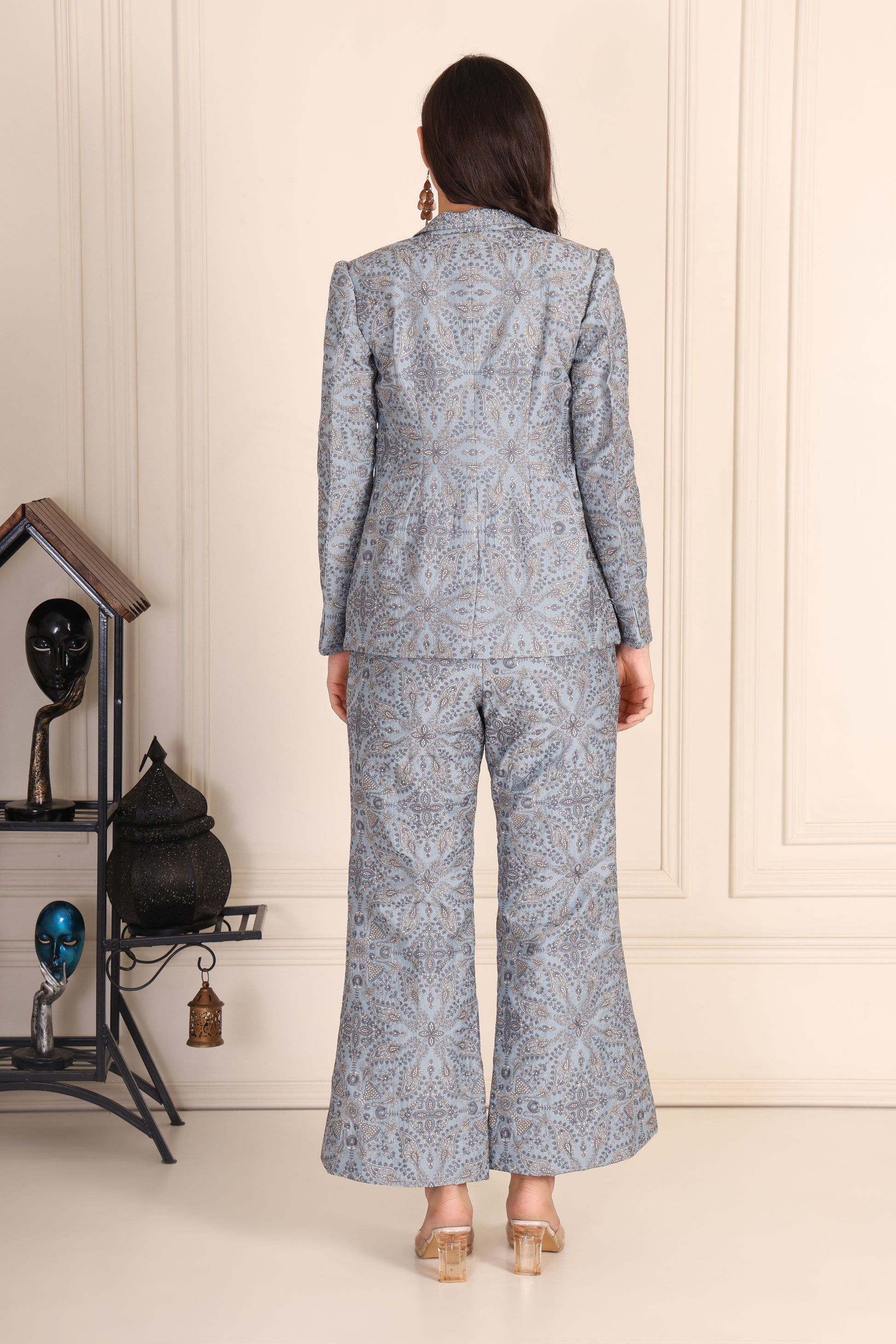 Zari Brocade Jacket set with Machine embroidery elegant smart Silk Brocade can wear in High Class Party & Full length of pant comfortable fitting jacket padded for comfort and support top jacket has one pocket in pant has side zip in night party wear aslo