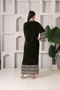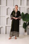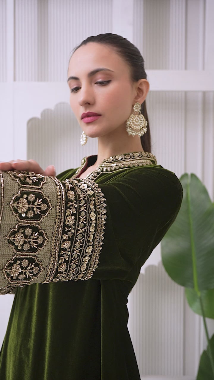 This Olive Green Velvet Kurta is crafted for women who love classic elegance with a rich, regal touch. Made from premium velvet fabric, it features intricate embroidery on the neckline, sleeves, and hem, creating a refined statement look. Olive elegance Where velvet meets timeless royalty.